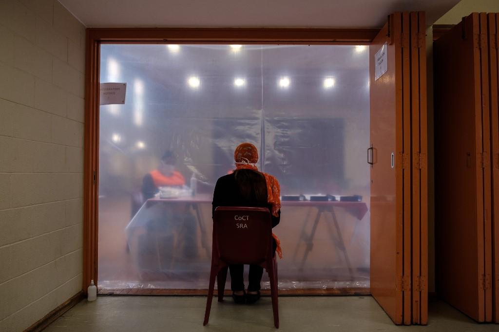 Un patient en consultation avec le personnel de santé avant d'être testé pour le Coronavirus COVID-19 au centre civique Schotsche Kloof dans le quartier historique de Bo-Kaap au Cap, Afrique du Sud, le 7 avril. Photographié par Barry Christianson / AFP.