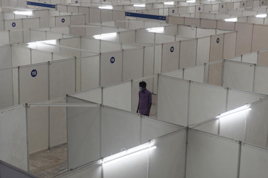 Un professionnel de santé prépare le Chennai Trade Centre qui sera bientôt converti en salle d'isolement d'une capacité de 600 lits, Chennai, Inde le 14 avril 2020 par Arun SANKAR / AFP.